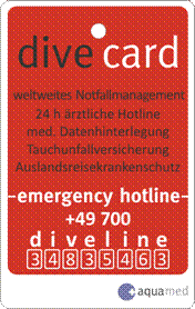 Oder aber ihr stellt euren Versicherungsantrag gleich direkt hier auf meinem Anmeldeformular! Die Versicherung (“dive card”) umfasst Auslandskrankenschutz und Rückholung sowie die Übernahme von Druckkammerkosten und die Bereitstellung einer 24h mit Tauchärzten besetzten, deutschsprachigen Hotline. Für PADI-Profis gibt es auch die Variante inklusive Berufshaftpflichtversicherung. Näheres auf Anfrage bzw. siehe unten. Open Water und Scuba Diver Schüler werden mit ihrer Zustimmung für die Dauer ihres Kurses bei mir kostenfrei mitversichert. Dieses von PADI und aqua-med ins Leben gerufene “Student Care” Programm deckt Druckkammerkosten ab und umfasst auch die tauchmedizinische Hotline. |